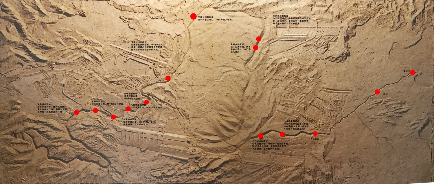 小浪底上游河段:按照地理位置將三門峽、龍羊峽、小浪底、萬家寨、劉家峽、青銅峽點綴其上(浮雕加簡介)。其余水利樞紐僅標(biāo)注位置以及投入使用時間。