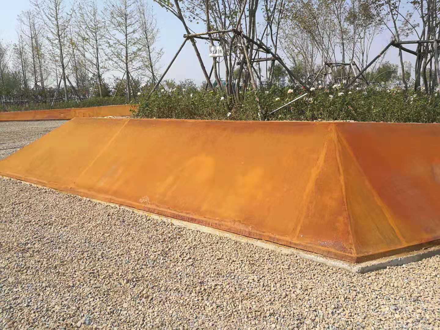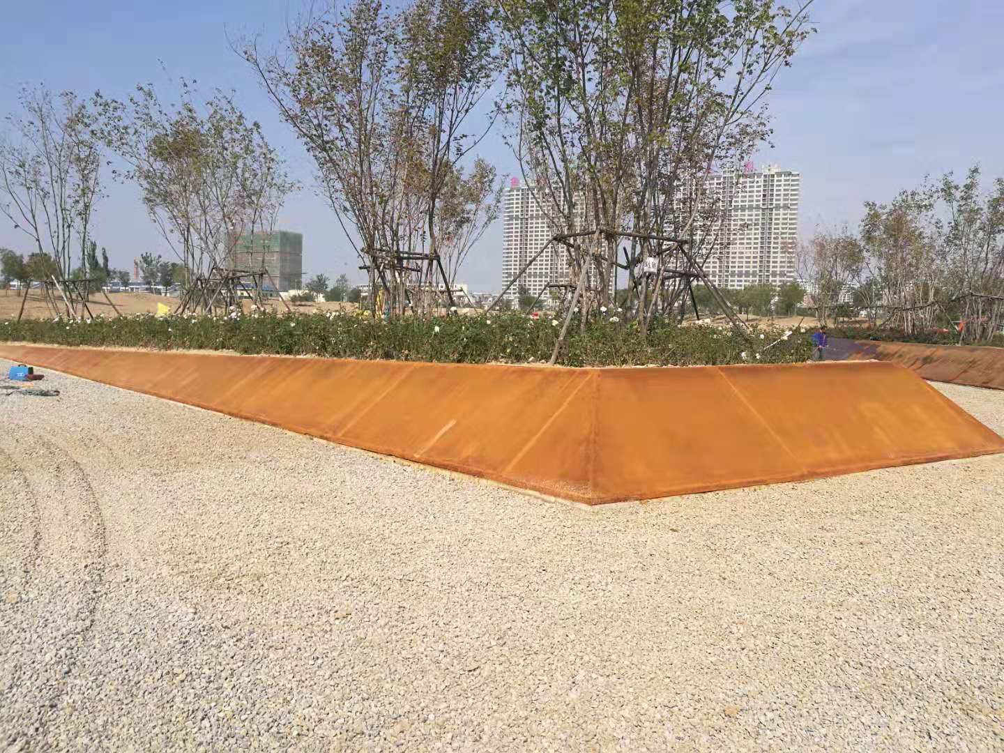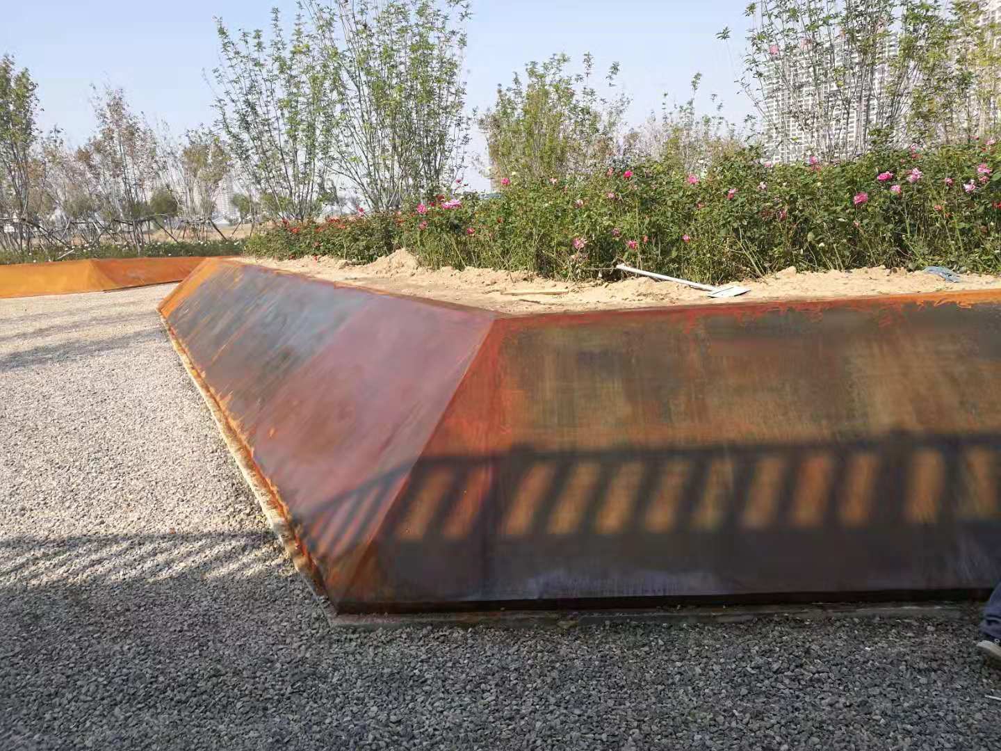 中海植物園即原來的中海景區(qū)東北角的原高爾夫球場區(qū)域,2018年改造升級為濱州中海植物園。所施工的銹板花池共7組,造型表面積共488平方米。造型板采用5mm厚銹板,支撐采用80mm*50mm*2.5mm的U形鋼。采用專業(yè)的耐候鋼生銹劑及固銹劑做表面處理。生銹的初期會呈黃色,然后隨著生銹進(jìn)程的推移,逐漸顯現(xiàn)金黃色,橙黃色,橙色,橙紅,紅褐色最后在紅褐,或者褐色穩(wěn)定下來。