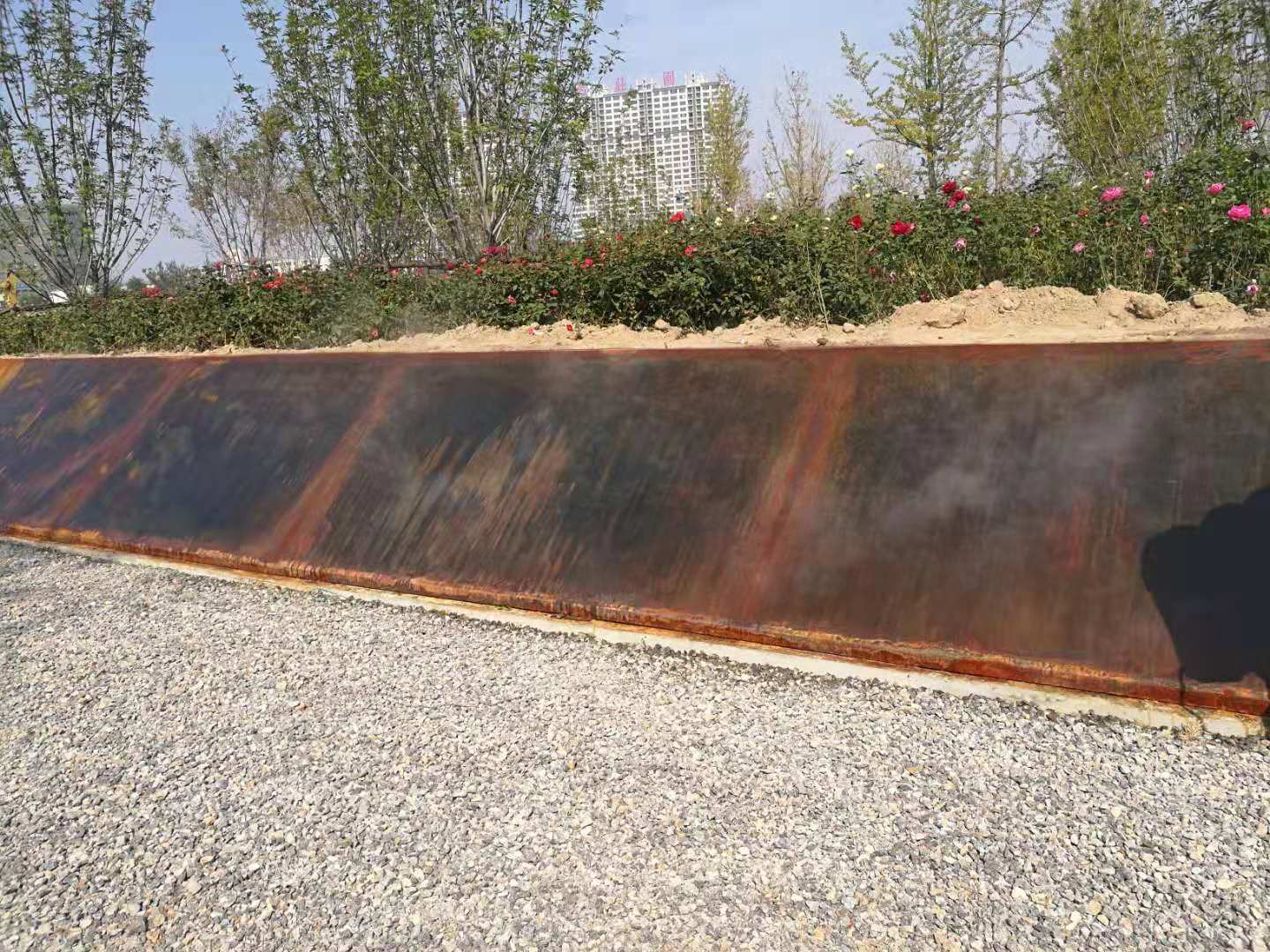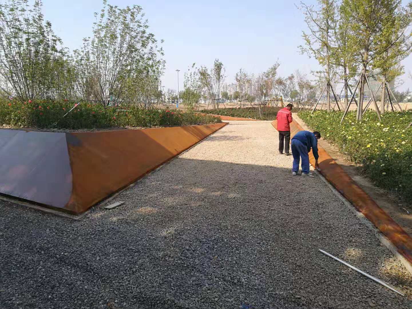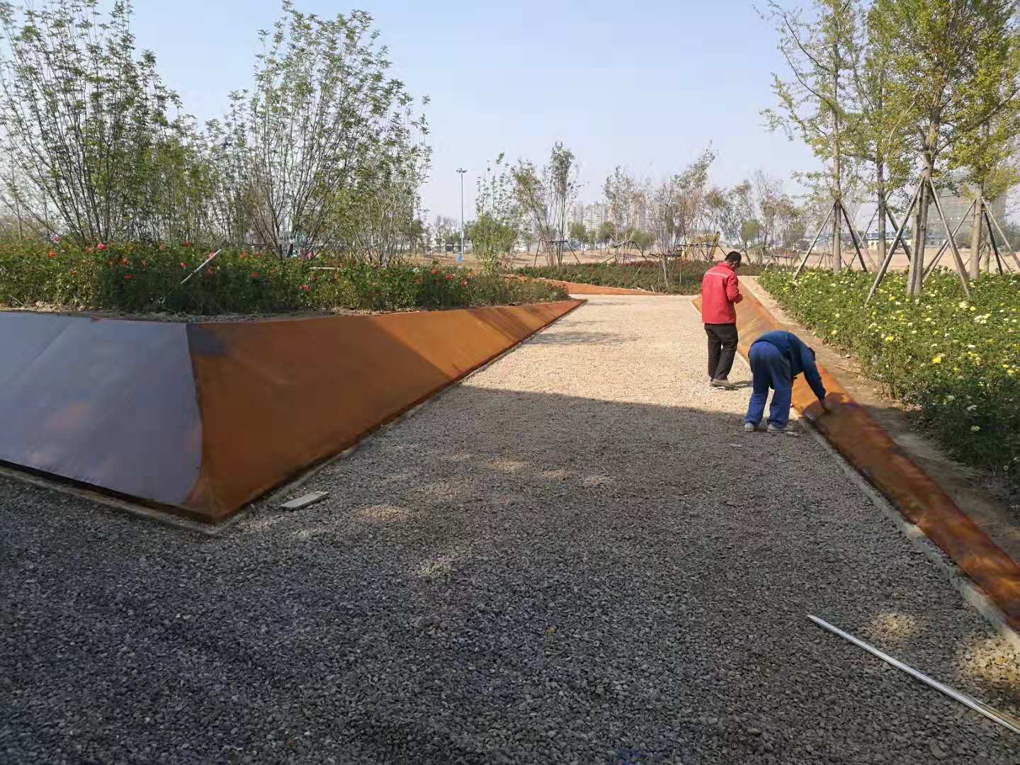 中海植物園即原來的中海景區(qū)東北角的原高爾夫球場區(qū)域,2018年改造升級為濱州中海植物園。所施工的銹板花池共7組,造型表面積共488平方米。造型板采用5mm厚銹板,支撐采用80mm*50mm*2.5mm的U形鋼。采用專業(yè)的耐候鋼生銹劑及固銹劑做表面處理。生銹的初期會呈黃色,然后隨著生銹進(jìn)程的推移,逐漸顯現(xiàn)金黃色,橙黃色,橙色,橙紅,紅褐色最后在紅褐,或者褐色穩(wěn)定下來。